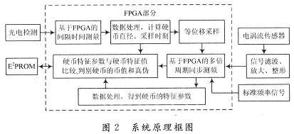 图2为系统原理框图。在币道的不同位置安装有几个光电传感器,通过基于FPGA的脉冲宽度测量,可检测得到硬币通过币道中光电传感器之问距离的间隔时间。通过FPGA的高速数据处理,可得到硬币的直径、硬币通过币道时的加速度,并得到硬币进行等位移多点采样的采样时刻。当硬币通过检测线圈时,就进行基于 FPGA的多倍周期同步测频。再由FPGA对数据进行高速处理,得到硬币的特征参数,再把该特征参数和E2PROM中的硬币特征值进行比较,就可以判别硬币的币值和真伪。