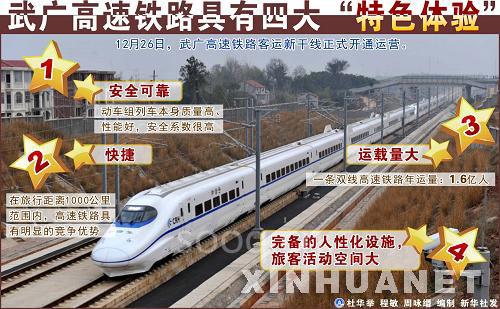 武广高铁采用世界上最先进的国产“和谐号”高速列车和牵引供电、列车控制等系统,时速350公里,从广州到武汉,运营里程1069公里,全程运行时间仅3小时,行车密度最高可达3分钟/列。在2009年12月9日试运行时,“和谐号”高速列车曾跑出394.2公里时速,创造了两车重联下的世界高速铁路最高运营速度。