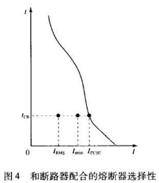 熔断器额定值可依据以下条件计算:①计算由断路器限制的电流波形有效值IRMS(见图3);②通过熔断器降额使用的系数Cf3计算电流Imin,Imin=IRMS/0.75;③复核熔断器时间电流特性曲线,确认熔断器在时间tCB(断路器在遇到故障电流时的动作时间)的弧前电流IFUSE(见图4),IFUSE≥Imin;④当前3个条件都得以满足,直流断路器动作时,熔断器不动作。