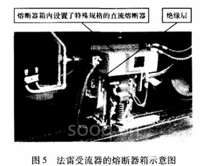 图5显示了针对750V直流系统的法雷受流器、熔断器箱和熔断器组合单元。该熔断器箱可以保护熔断器不受来自外界物质的损害,并防止灰尘累计破坏熔断器端子处的绝缘。熔断器箱延伸到了受流器背后,形成受流器和转向架之问的绝缘层。它与绝缘层为一体化设计,并采用阻燃剂绝缘材料。