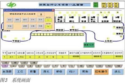 (2)主控柜安装了一台HMI,选用菲尼克斯电气TP 12T触摸屏,对18台小车进行启动、停止、吊具的升降及各工序工艺时间的控制和操作;实时显示整线运行情况,在线显示车组状态、位置、所载工件类别和当前工艺节拍状态等信息,并能进行故障诊断和报警(见图3)。