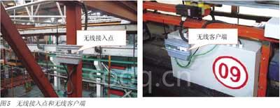 (2)设置无线接入点(AP)2台。经测试实际用1个无线接入点就可以满足系统通信需求,最终采用了两个无线接入点的方案,一方面是考虑到其中任一台出现故障,另一个仍然可以确保网络正常运行,起到热备的作用,提高了系统的可靠性;另一方面采用两个无线接入点可以实现无线客户端漫游通信,两个无线接入点都正常时,不管小车运行到哪个位置无线客户端都能保持与无线接入点的通信距离,保证获得非常好的通信质量。现场无线接入点和无线客户端以及设置如图5、图6所示。