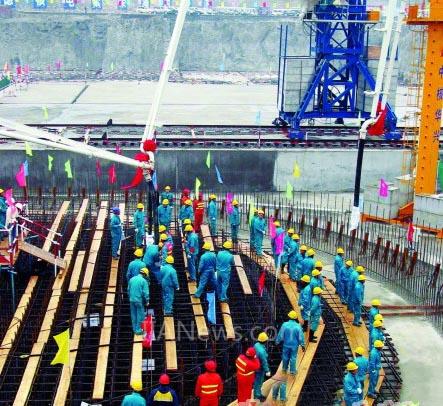 08年2月18日,在福建宁德核电站建设工地,工人们开始浇注第一罐混凝土
