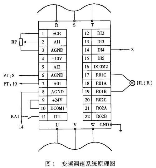 变频调速系统原理图见图1。调速电位器(RP)接至变频器的外部给定调节输入点(SCR、AI1、AGND),可以使变频器的输出频率在0~50Hz范围内改变,从而实现对变频电机的无级调速;将控制柜面板上的数显表接至变频器的输出频率点(AGND、A01),在数显表上动态显示变频器的输出转速;将报警灯接至变频器的继电器输出点(ROIB、ROIC),当变频器工作异常时报警。