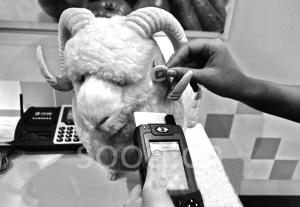 工作人员用扫描仪对绵羊的电子身份标签进行扫描