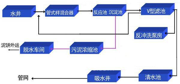 随着城市现代化建设的发展,环境保护、生活用水的要求不断提高。以前水厂的人工、半自动水厂控制系统已经远远不能满足现代化生活和企业运作的需要,因此先进的计算机控制技术应运而生。通过先进的自动控制系统,可实现对水厂制水、污水处理、水软化、送配水等工程运作的监视和控制。江西省新余市第四水厂于2008年9月建成通水,第一期规模为15万吨/天。第四水厂采用图1所示的工艺流程,主要包括取水泵房、加矾加氯间、V型滤池站和送水泵房等控制站。该水厂实现了自动控制和系统主要参数的在线监测;同时为节约水资源,保护水体不受污染,对滤池反冲洗水进行回收,二期拟对污泥进行浓缩处理。