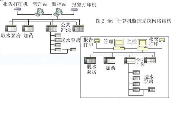 各PLC站与中控室之间采用工业以太网通讯联络。中控室由2台分别用于生产管理与监控的计算机及2台激光打印机组成。计算机采用Windows XP(sp2)操作系统。其中监控计算机采用世纪星组态软件开发的应用软件,可显示多个包括涉及PLC控制的机电、加矾加氯设备与滤池等在内的模拟画面,可对系统的所有设备进行远程操作和控制,并具备显示工艺布置图、实时动态参数、设备的工作状态及实时/历史报警信号、在线仪表的实时/历史趋势曲线、水泵运行时间等功能,同时可进行离线/在线编程及设定参数的修改,编制和打印生产与管理报表。管理计算机采用Excel软件,用于采集与存储监控计算机检测的主要生产数据,以便用于管理。