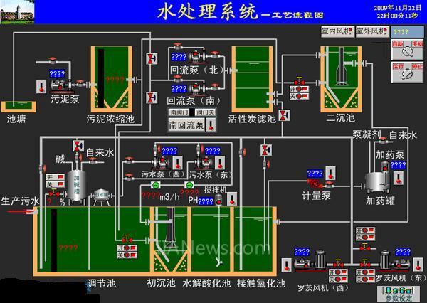 B、监测整个生产工艺流程和各细部的动态模拟图形。该系统实现了水厂整体工艺流程、各主要工艺设备运行状态、过程控制及各生产环节生产数据的实时采集与现实。主要流程画面有:取水泵房流程图、加矾间流程图、加氯间流程、反应沉淀池流程、V型滤池流程、公共冲洗泵房流程、送水泵房流程、10kV一次系统、低压系统等画面。实现的工艺生产设备监控功能有:所有被监控设备的运行状态、启停控制、设备与设备之间的连锁控制、工艺参数的设定,以及设备温度、电流、压力、液位、流量等参数的显示、报警、记录、趋势及累积量计算等。