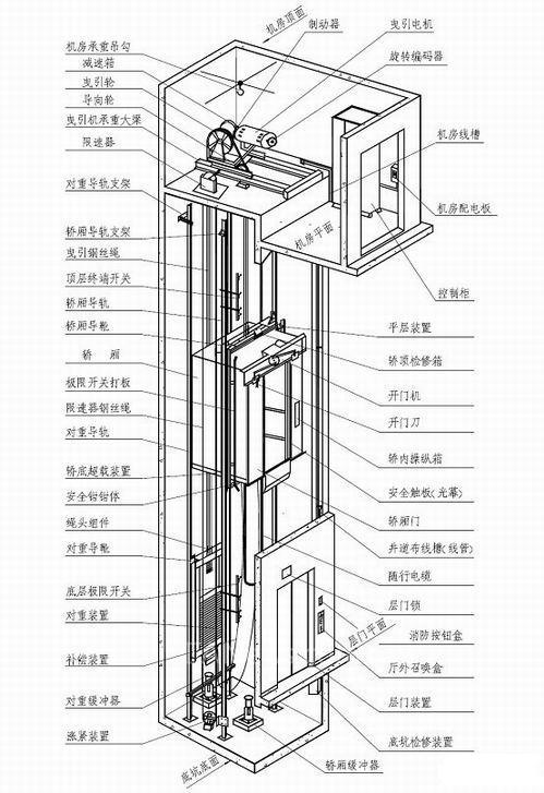 电梯的结构及其装备可分为机械、电气两大部分,现将组成电梯的主要部件按其安装部位的不同分别介绍,并说明其作用如下: