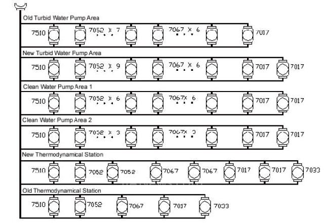 新浑水泵区共有6 台浑水泵,它和5 台老浑水泵完成同样的功能,只是设备比较新,即使用水淡季,6 台泵也是常开的。两个浑水泵区相距大概400 米。该区也用到了I-7052?pI-7067?pI-7017 和I-7510 共21 个模块来完成泵和阀门的数据采集和控制。