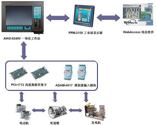 该系统采用研华一体化工作站AWS-8248,用于连接工业及显示器FPM-2150和数据采集卡PCI-1712,在实现显示的同时输出显示到中控室。PCI-1712用于输出控制参数,实现对变速箱的加载、换档等操作,同时读取变速箱运行参数:温度、转速、扭矩、噪音等,并借助于WebAccess组态软件实现数据记录与实时监控,遇到故障后能够自动报警、自动分析。
