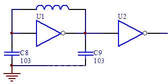 探测模块是一个由探测线圈和反相器构成振荡器的选频模块[4]。由于传感器的振荡频率包含了被测信息,保持短期频率的稳定性十分关键;而且好的振荡波形有利于单片机测频,减少误判和漏判的发生。因此,从工作频段、频率稳定性和振荡波形三方面考虑,本文采用了电容三点式振荡电路[5~6]。另外,为了便于单片机测量,设计中加入了整形电路,其功能是将振荡电路产生的正弦信号整形成同频率的方波信号。具体电路如图2所示。