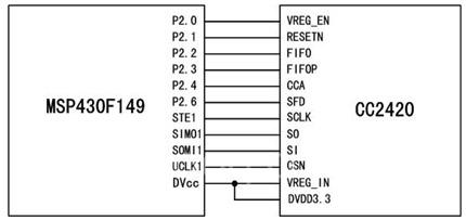 MSP430F149通过4线SPI总线(STE1、SIMO1、SOMI1、UCLK1)控制和设置芯片的工作模式,并实现读/写缓存数据,读/写状态寄存器等。通过控制FIFO和FIFOP引脚接口的状态可设置发射/接收缓存器,FIFOP引脚必须连接到单片机的中断引脚。通过CCA引脚状态可以得到空闲信道估计。通过SFD引脚状态可以得到发射帧和接收帧的定时信息从而判断系统的工作状态,SFD引脚应该接到单片机的时钟捕捉引脚。