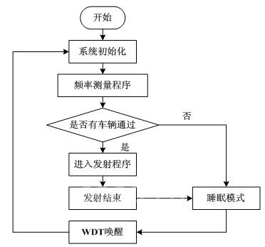 系统初始化程序主要包括MSP430F149时钟的设置、各个通讯端口的设置,定时器的设置等。当系统设置好后,进入频率测量程序。频率测量程序主要包括频率变化量的测量、阈值的校准、抗干扰的处理。若没有检测到车辆,则系统进入低功耗模式。如果所测得频率值大于阈值,则进入发射程序,发射检测到车辆的信号。发射结束后系统进入低功耗模式,此时启动看门狗定时器(WDT),当看门狗定时器溢出时唤醒系统,进行下一次测量。