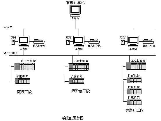 本系统采用 TSX Premium P57-20 处理器作为系统中央处理器,配备相应离散量 / 开关量输入输出模块,针对配煤工段、筛贮焦工段以及配煤工段分别配置三套系统,通过总线式工业以太网实现系统连接。系统配置总图如下: