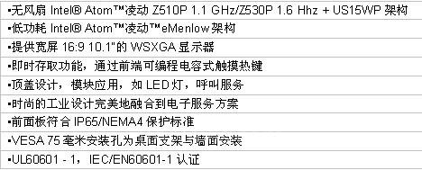 研华UTC-W101智能触控电脑专为交互式应用程序设计,适用于零售、医疗等行业领域,尤其是e-service 领域。该产品拥有时尚的工业设计,简约的外观可方便用户更直接地使用。这款高效的智能触控电脑拥有呼叫服务LED灯,通过前置可编程热键可进行即时功能访问。同时,该产品拥有工业级的可靠,可抗冲击、抗振动性能优异。研华UTC-W101智能触控电脑所提供的信息内容服务,可提高服务水平和客户满意度,获得系统集成商及合作伙伴一致好评。