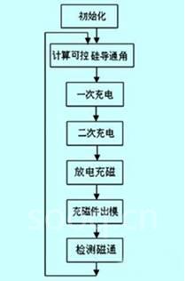 充磁后的工件被气阀顶到检测磁通的线圈前,应先对图1中积分电容短接放电(检测清零),随后磁性工件插入线圈中,就能检查到产品的磁通量,从而鉴别本批产品性能要求,同时,可稳定双向可控硅的导通角,以确保产品的质量。