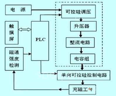 图2为充磁机系统示意图。电路是由可调直流高压电源、放电开关电路、plc控制器、触摸屏、磁通检测和充磁头等电路组成。控制要求: