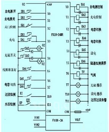 图4为系统控制电路,选三菱fx1n-24mr为系统主控器,模拟量fx0n-3a有二个输入和一个输出,其中输入检测电流信号和磁通信号,输出控制双向可控硅的导通角。