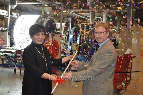 飞利浦高层将生产出的写有经销商名字的第一支灯管,亲手交到客户手中