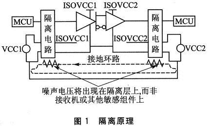 在工程实际使用中,经常发生通过电缆逻辑接地或屏蔽将这些地线连接在一起的情况,可能形成接地环路,且电流将流入该电缆。接地环路电流会对通信产生严重影响(包括数据恶化、EMI过大、元件损坏),当电位差足够大时,人体就有遭受电击的可能。为了避免上述破坏,可引入非直接的(导电)电连接(称作“隔离”)。进行隔离是为了消除噪声并且防止电流在两通信端之间流动。隔离电路具有相对于其他电路元件极高的阻抗,从而“切断”了由电路路径形成的环路;断开环路后,噪声电压将出现在隔离层上而非接收机或其他敏感组件上。隔离原理如图1所示。