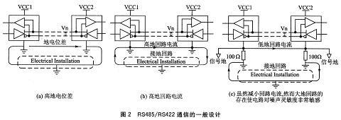 对于图2(a)的设计,远程数据连接通常存在很大的地电位差(GDP),该电位差到了发送器的输出上就成了共模噪声。如果这种噪声过大,就可能超过接收器的输入共模噪声容限,从而造成器件损坏。图2(b)中的设计方法对高阻型共模干扰有效,由于干扰源内阻大,短接后不会形成很大的接地环路电流,对于通信不会有很大影响。但当共模干扰源内阻较低时,会在接地线上形成较大的环路电流,耦合到数据线中成为共模噪声,影响正常通信。图2(c)实际上是在接地线上加限流电阻限制干扰电流,但大地接地回路的存在使数据链路对回路中其他地方产生的噪声非常敏感。