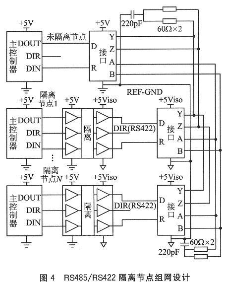 总的来说,图2(c)的方案比前两种合适,但建立长距离数据链路的最可靠的方法是通过数字隔离方案来隔断接地回路,其单节点设计如图3所示。