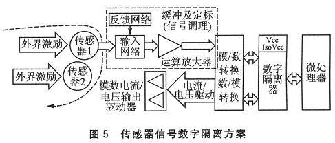 许多硬件设计任务主要围绕如下方面展开:数/模转换器(DAC)、模/数转换器(ADC)、输入和输出信号调理、输入/输出模块的电气连线、控制器之间以及模块之间的隔离问题。各种传感器产生的数字信号都传送到一个中央控制器,进行处理和分析。为了保证用户接口端电压的安全性,同时防止瞬态尖峰的传输,需要实现电流隔离。对于传感器信号隔离,传统的模拟隔离方案(如隔离放大器AD202)成本太高,可以采用数字隔离方案——AMP→ADC→Digital Isolate→MCU降低成本,如图5所示。