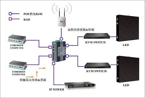 本系统采用研华EKI-2526PI PoE工业以太网交换机,作为整个户外LED大屏幕的通讯枢纽。EKI-2526PI分别连接LED显示屏,多主机切换器(KVM Switch),IP电源(IP Power),无线AP和嵌入式工控机(Embedded Computer)。由于8m2户外LED大屏幕可布线的空间有限,其中多主机切换器(KVM Switch)和无线AP通过PoE端口供电,布局更加合理。