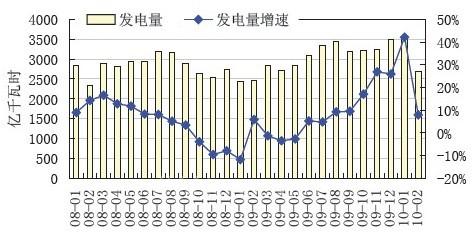 09 年完成发电量36506 亿千瓦时,同比增长7.1%,增幅同比上升1.9 个百分点。分季度来看,受国际金融危机影响,1 季度发电量明显下滑; 2 季度在经济回暖及夏季高温用电需求带动下,发电量下滑速度趋缓;3 季度发电量增速实现由负转正;4 季度以来受工业强劲复苏及08 年同期基数较低等因素影响,发电量加速回升。2010年1~2 月份,发电量6090 亿千瓦时,同比增长22.1%。