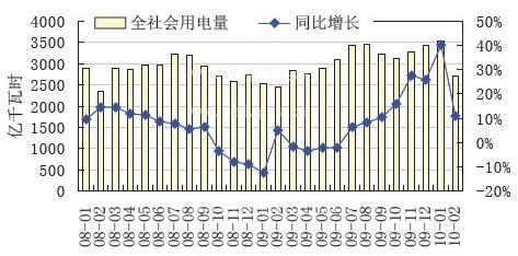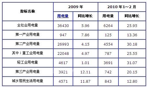 从用电结构来看,09 年第二产业用电逐步恢复,各季度增速分别为-8.21%、-3.51%、5.85%和23.30%,全年增速为4.15%。第一产业、第三产业及居民生活用电稳定增长,增速分别为7.86%、12.11%和11.87%。2010 年1~2 月份,第二产业用电量同比增速最快,达到30.2%。第一产业、第三产业和居民生活用电量分别增长13.4%、20.2%和12.8%,增幅同比提高8.5、12.5 和1.9 个百分点;
