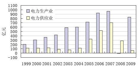 1999~2009 年电力生产业与电力供应业利润总额比较