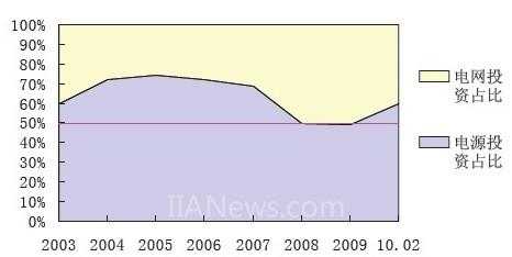09 年全国电力建设完成投资7558 亿元,同比增长19.93%。其中,电源投资3711 亿元,增长8.92%,占全部投资的49.10%;电网投资3847 亿元,增长32.89%,占全部投资的50.90%,比重较上年提高0.8 个百分点。2010 年1~2 月份,电源和电网基本建设投资分别为347 亿元和231 亿元。电源基建投资结构也加快调整,09 年水电、风电、核电基本建设投资完成额同比分别增长2.33%、43.90%和74.91%,火电基本建设投资完成额同比下降11.11 %。
