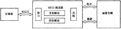 车辆自动识别系统(Automatic Vehicle Iden—tification,AⅥ),可准确无误地自动识别并采集路网中运行车辆的身份特征信息和法定管理信息,使车辆信息瞬时进入计算机,可为车辆及交通管理部门提供一个实时、动态的车辆信息采集平台。本文采用了RFID技术设计和实现了汽车号牌自动识别系统,该系统的硬件是由读写单元(标签阅读器)和标签号牌组成,阅读器通过线路与计算机的RS32接口通信,其系统硬件框架如图1所示。