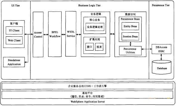 (1)系统模型:各模块都是基于服务实现的,这些服务提供可被调用的Web Services接口。通过单个服务或者多个服务的组合来形成业务流程,从而构成各业务子模块。各子模块通过SOAP消息进行通信,相互访问业务资源。系统从逻辑上分为3层:持久层、业务逻辑层、表示层。其中,持久层实现了业务对象数据的固化过程,主要封装了通过JDBC访问数据库的一些方法,业务对象数据最终存储的地方,例如Oracle、DB2、SQLServer数据库等;业务逻辑层实现业务逻辑、服务封装和数据访问代理的功能,并采用一致的组织策略对所有业务实体进行统一表示,对封装的Web服务提供查找和逻辑组合功能,业务实体和数据类的映射采用XML配置文件实现,业务逻辑层也是应用服务器上的UI层代理,作为UI和中间业务逻辑层以及业务流程引擎打交道的桥梁,可以根据界面的要求组织业务逻辑层的调用;表示层是最终用户的使用界面,包括Java应用程序、JavaApplet、Scrvlet或者JSP程序统称为UI层,主要体现与用户的交互过程。系统模型如图1所示。