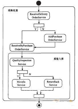 (3)服务组合及流程编排:采用BPEL流程管理器将上述定义好的Web服务进行编排,定义这些Web服务操作的执行顺序,并将聚集Web服务定义的操作映射到内含的Web服务所实现的操作中去。流程模型通过定义一个公共接口或操作的portType表示聚集Web服务。如图3所示,在采购收货流程中,将定义的Web服务:接收交换单服务(ReceiveDeliveryOrderService)、按采购订单收货服务(ReceiveByPurchaseOrderService)、补采购订单服务(AddeurchaseOrderService)、质量检验服务(QualitylnspectionService)、入库服务(MoveInService)、退货服务(RetumBackService),通过BPEL业务流程执行语言进行编排,实现这些服务的连接。