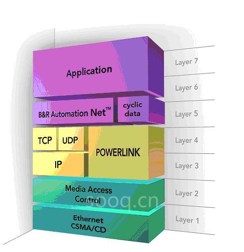 OSI模型表示了ETHERNET POWERLINK协议与上下各层次之间的关系。它表明使用CSMA/CD访问方法和媒体访问控制(MAC)的ETHERNET层处于基础的位置。上方各层(IP与TCP或UDP)则由POWERLINK协议取而代之。B&R Automation NetTM也使用TCP/IP或UDP/IP,不过仍能够与ETHERNET POWERLINK协同工作。因此,与应用层也就实现了高速循环数据通信。