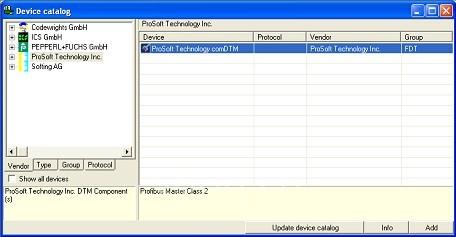 2. 升级或者更新设备目录。如果 PROFIBUS comDTM 安装成功,供应商选项卡里会出现 ProSoft 技术公司的字样。