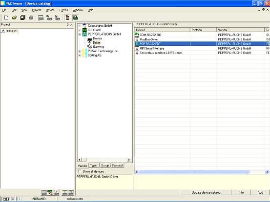 选择一个你要进行设备连接的厂商名称,如 PEPPERL+FUCHS GmbH。中间浏览器会出现三个子项名称:设备、驱动器和网关。我们用鼠标点击驱动器,右侧窗口会出现五个已经安装的驱动器:COM-RS232-300、Modbus-Driver、P2P-RS232-FDT、RPI Serial Interface和ServiceBus Interface LB/FB series。