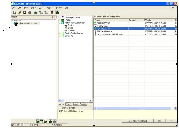 我们如图选择P2P-RS232-FDT并双击鼠标,则会出现下面图形,在左侧浏览器窗口,在HOST PC下,出现了你刚建立的[*]<0>P2P RS232 FDT的子目录,第一步工作就完成了。