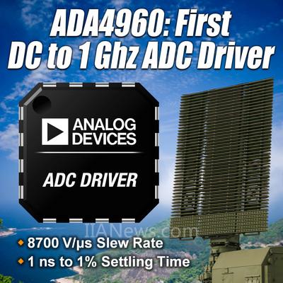 -- ADI公司的 ADA4960-1差分放大器是业界首款可驱动8位线性度、1 GHz 数据转换器信号的放大器。