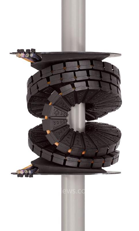 总部位于科隆的易格斯Igus公司,开发了一个创新的紧凑型能链系统Energy Chain,在非常局限的空间内可旋转3000度。铰链TB30 。 能够在低磨损的情况下带来能源,数据和介质的低成本。由于质量造成的离心力小,所以它的转速能达到720°/S, 过程中,所有电缆都置于轴的附近。因为需要的空间很小,energy chain system 能安全的用于所有安装位置(水平,垂直或架空)。拖链主要应用于机器人(1轴或6轴)或特殊的机械工程任务。局限空间内的扭转运动在装置的处理,提升及组装过程,试验台和试验钻井平台上同样非常普遍。风力涡轮机是另一个应用领域,翼板可以在旋转运动中进行调节。