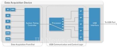 USB在测量应用中也存在对其自身的挑战。举例来说,高速USB的60 MB/s理论带宽对于大多数DAQ应用来说是足够的;然而,在设计USB DAQ的软硬件中,为了达到这个理论带宽还需要克服几项障碍。USB是由主机驱动的串口协议,也就是说操作系统必须初始化所有数据传输请求。这种异步数据传输方式会降低确定性并增加CPU的负担。解决该问题的一种方法是将数据缓冲到设备的额外存储器上。这将有助于克服数据丢失,但却增加了延迟和设备成本。我们真正需要的是一种在USB上支持多DAQ数据传输的方法。在许多设备中,这种想法受到传统板载系统构架的限制。