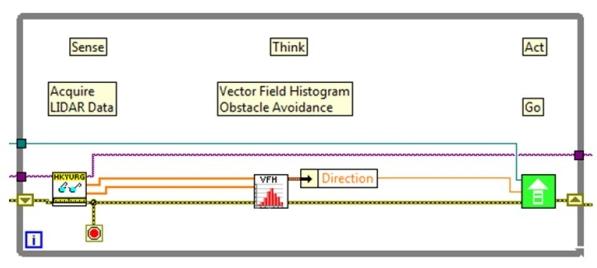 图4 机器人设计软件应该是非常直观的。LabVIEW图形化编程通过直观的框图和连线完成了LIDAR数据采集、障碍物回避决策、刹车制动等三个步骤,清晰易读(有文字的淡黄色部分为程序注释)