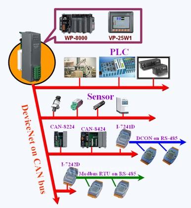 DeviceNet是一个简单的而且开放式的网络解决方案,能有效地降低配线成本,节省安装设备的时间。通过标准的DeviceNet通讯协议,使用者可以将不同厂牌的DeviceNet slave设备快速地整合在同一个网络中。泓格公司的DeviceNet master产品,I-8124W模块,能为WinPAC或是ViewPAC控制器扩充一组单端口的DeviceNet master通讯界面。结合WinPAC或ViewPAC的优势,I-8124W更能表现出它高效的控制方式与弹性的应用架构,以下将向大家展示一个典型的网络架构。
