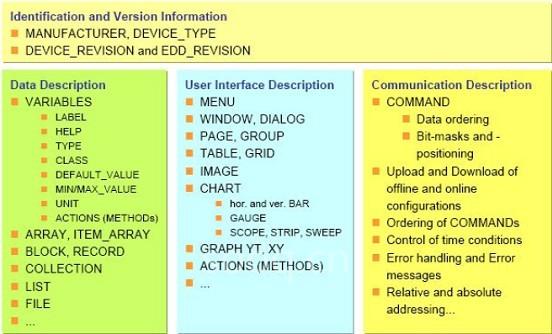 EDDL 是一种描述设备数据的精确声明,表示了数据怎样通信和怎样显示; 它不是一种设备驱动程序。声明基于关键字,与 XML 或 HTML 网页标签类似, 包括数据类型、标签、多种语言的帮助文档、分类、单位、量程和其他项目。EDDL 也包括交互方法,这种方法基于 ANSI(美国国家标准学会)C的子集,指导技术员逐步完成交互过程。