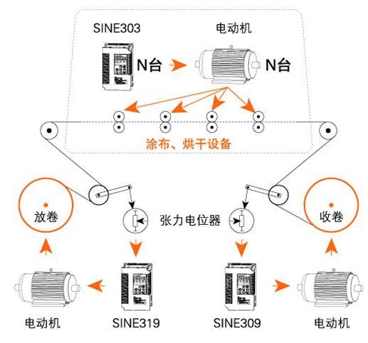 涂布及烘干:SINE303开环矢量控制变频器,四台,比例联动控制,主信号和微调信号按设定比例叠加运行。