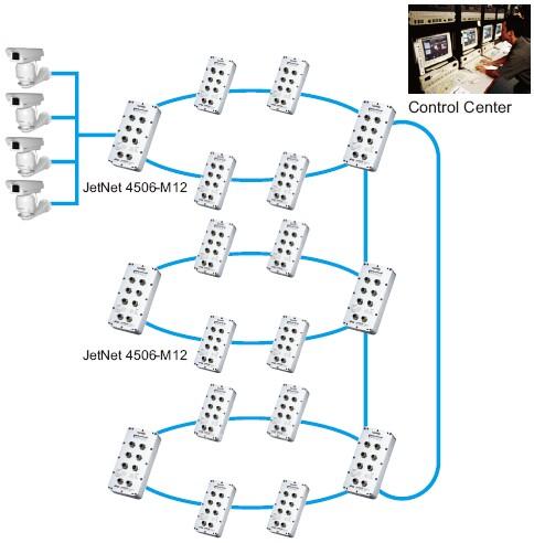 在挪威,有超过100台Korenix JetNet 4506-M12工业以太网交换机用于海上钻井平台,它满足IP68工业防护等级,能够抵御高湿度,高灰尘和高振动影响,持续稳定运行。支持MSR (Multiple Super Ring)快速自愈环网协议,在海上平台上按区域组成多环冗余结构,将实时的影像流传送到监控中心,同时将控制信息送到现场。此外,为了优化网络传输质量,针对多播视频任务启用IGMP组播协议,可以将视频送到指定的监控点,节省网络带宽。