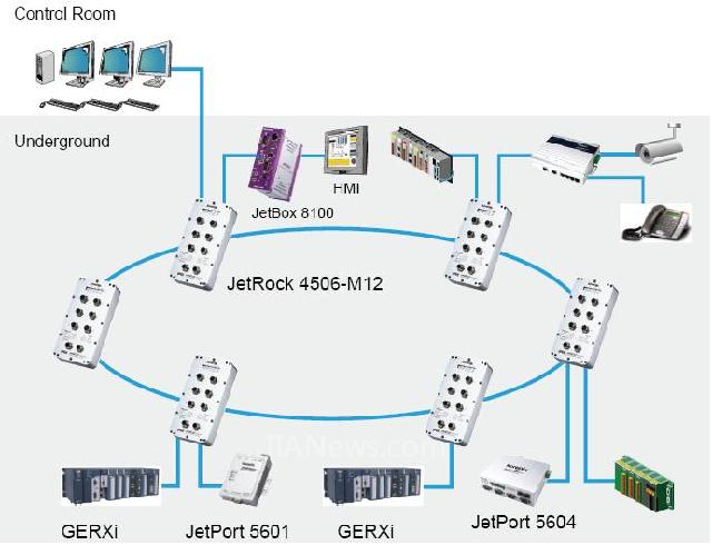 JetNet 4506-RJ支持Korenix专利环网冗余技术,提供全球最快的环网自愈,网络断线恢复时间小于5ms。JetNet 3706-RJ配备4个PoE以太网供电端口,是恶劣环境PoE应用的理想方案,为IP摄像头和IP电话提供稳定的电源供应和可靠的数据连线。串口界面的区域控制器由JetBox 8100工业通讯计算机和JetPort串口设备联网服务器通过TCP/IP网络来统一管理。地表的控制机房则采用满足IP 67防护等级的JetWave工业无线AP来与分布广泛的采矿区联网,最大无线网络覆盖范围可达40km。