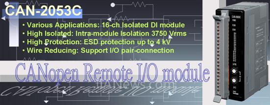 具有16个隔离型DI通道的CAN-2053C提供经济的CANopen从端解决方案。这个模块符合CiA的CANopen标准规范,并遵循DS-301规范4.02版与DSP-401规范2.1版。不仅通过CiA CANopen Conformance Test软件的验证,让用户能安心的将CAN-2053C安装于任何CANopen网络上,也提供符合标准的EDS档案,通过这个档案,用户可以非常容易的应用CAN-2053C于任何标准的CANopen主端接口。再者,多功能的DI通道设计,允许使用者将其运用在PNP、NPN、TTL、relay contact等架构上,因此能满足大部分的应用领域。通过特殊的I/O pair-connection功能,用户只需准备一个CAN-2053C与一个适当的CAN-2000C系列DO模块(例如CAN-2057C),调整这两个模块的旋转开关,设定波特率与站号后,将两者的CAN bus互相连接,那么CAN-2053C的DI输入讯号就可以通过CAN bus直接控制远程的DO模块的数字输出。